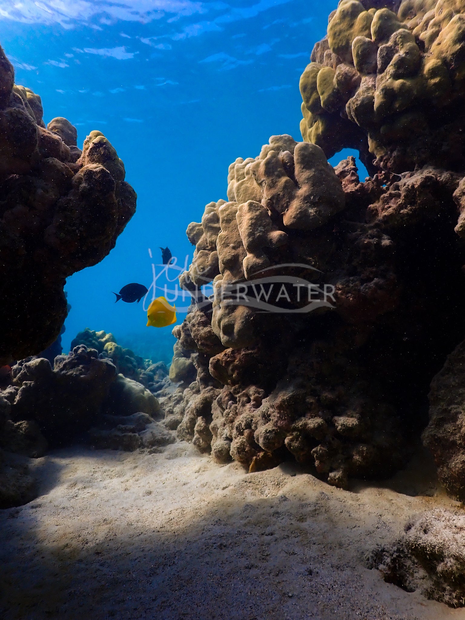 Dive down to the ocean bed where vibrant coral formations and colorful fish dance in the crystal-clear waters of the Kohala Coast. Experience a whimsical underwater scene full of life and wonder.